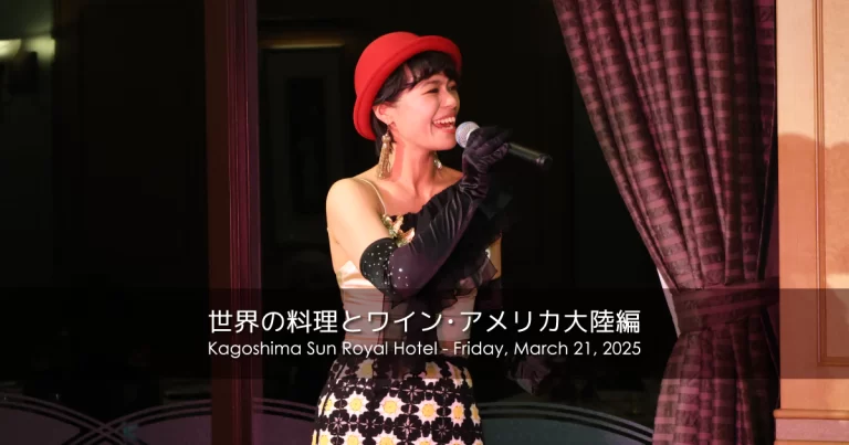 錦江湾と桜島を一望できる、鹿児島サンロイヤルホテルのスカイラウンジ フェニックスで開催された「世界の料理とワインを楽しむ夕べ〜アメリカ大陸編〜」にて、サプライズステージで歌わせていただきました❣ このイベントは、各国の料 … 続きを読む 鹿児島サンロイヤルホテル 世界の料理とワイン アメリカ大陸編
